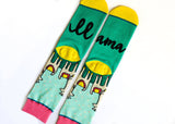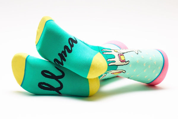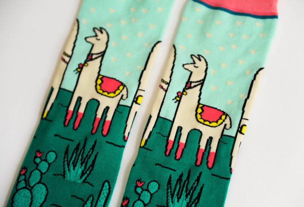 Get those feet up and relax, you no-drama-llama. Wearing these south of the border inspired beauties is sure to make your day happy and bright. Each pear features bright pops of color, cacti, greenery and a llama wearing a saddle. What more is needed on a sock this glorious?